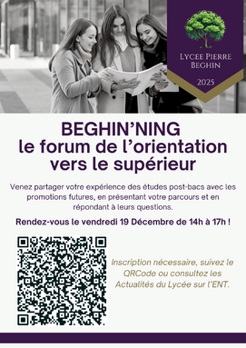 Le Lycée Pierre Béghin de Moirans souhaite organiser un forum de l’orientation à destination de ses élèves. Ce projet « Beghin’ning » a pour objectif d’apporter un maximum d’informations et d’opportunités aux élèves futurs bacheliers.